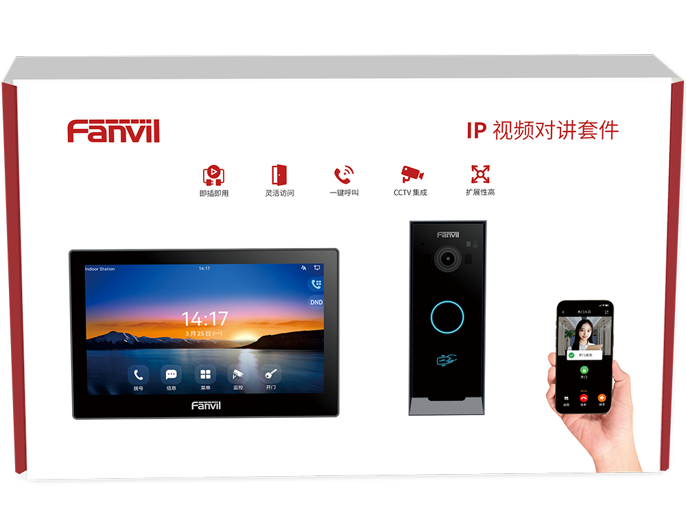 VIK-01 视频对讲套装集成 i504W SIP室内机、i60视频门禁和Fanvil Link App,适用于别墅、独户住宅等场景。用户可通过室内机或手机与访客进行高清视频通话并远程开门,提供刷卡、手机app等多种开门方式,并支持2.4G/5G双频Wi-Fi。只需连接电源与网络,完成简单配置,即可实现即插即用,快速安装。