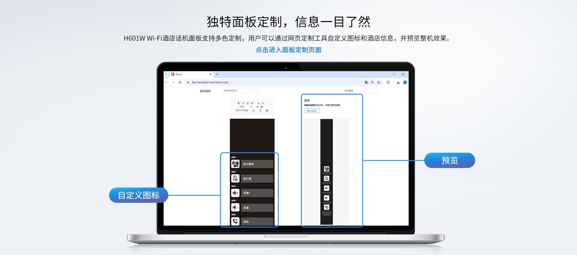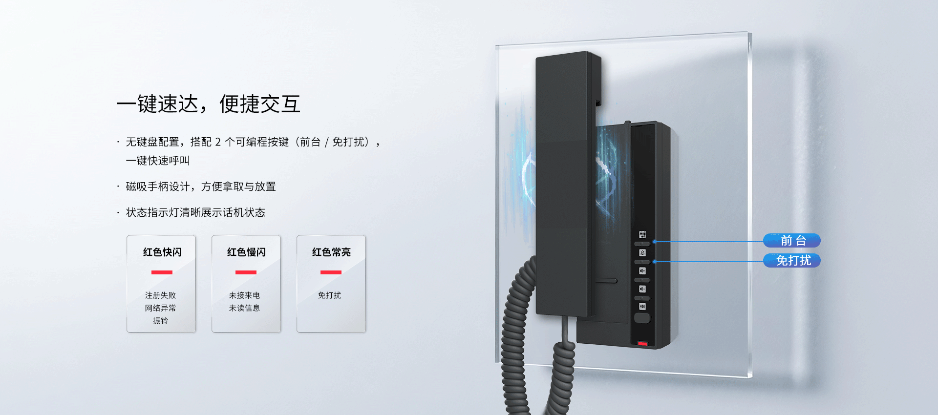 方位H601W作为一款经济实用、外观小巧的无屏Wi-Fi酒店话机,配备2个可编程按键,支持宽频Opus高清语音编码,H601W内置双频 2.4G & 5G Wi-Fi,支持Wi-Fi 6,不仅提供更稳定的无线连接,还有效降低酒店网络部署成本;设计紧凑,节省空间,支持壁挂安装,满足酒店、商场、医院、超市等各种场景灵活部署的需求,为用户提供便捷高效的使用体验。