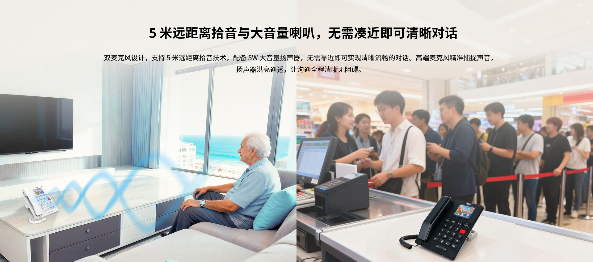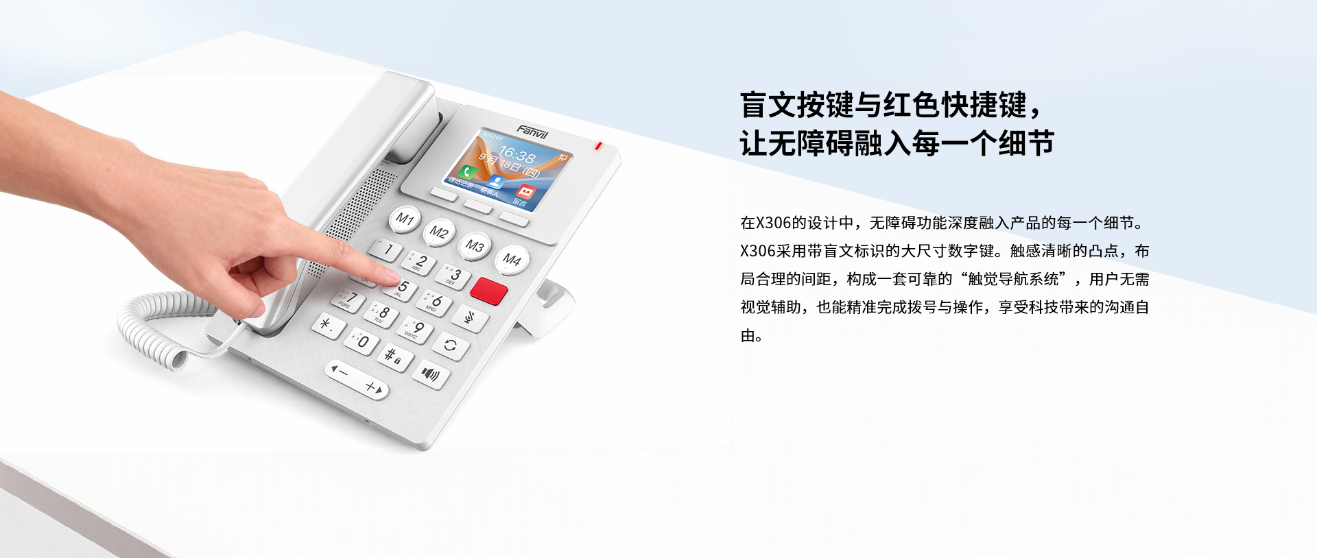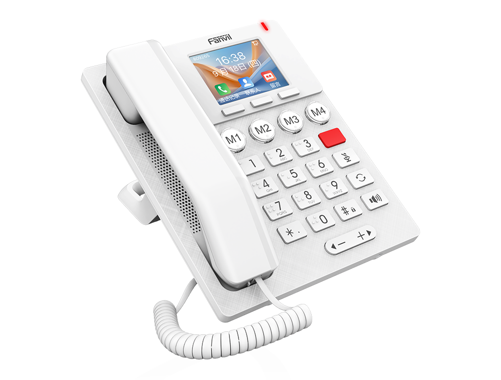 方位X306是一款为追求清晰视觉、便捷操作和洪亮音质的用户设计的易用型IP话机,配备3.5英寸高清彩屏、带盲文标识的大按键及醒目的红色按键,操作直观便捷。内置双频Wi-Fi 6和蓝牙5.0模块,支持双SIP线路、PoE供电,并具备超大音量与5米远距拾音,为用户带来清晰稳定的语音表现及高效的操作体验